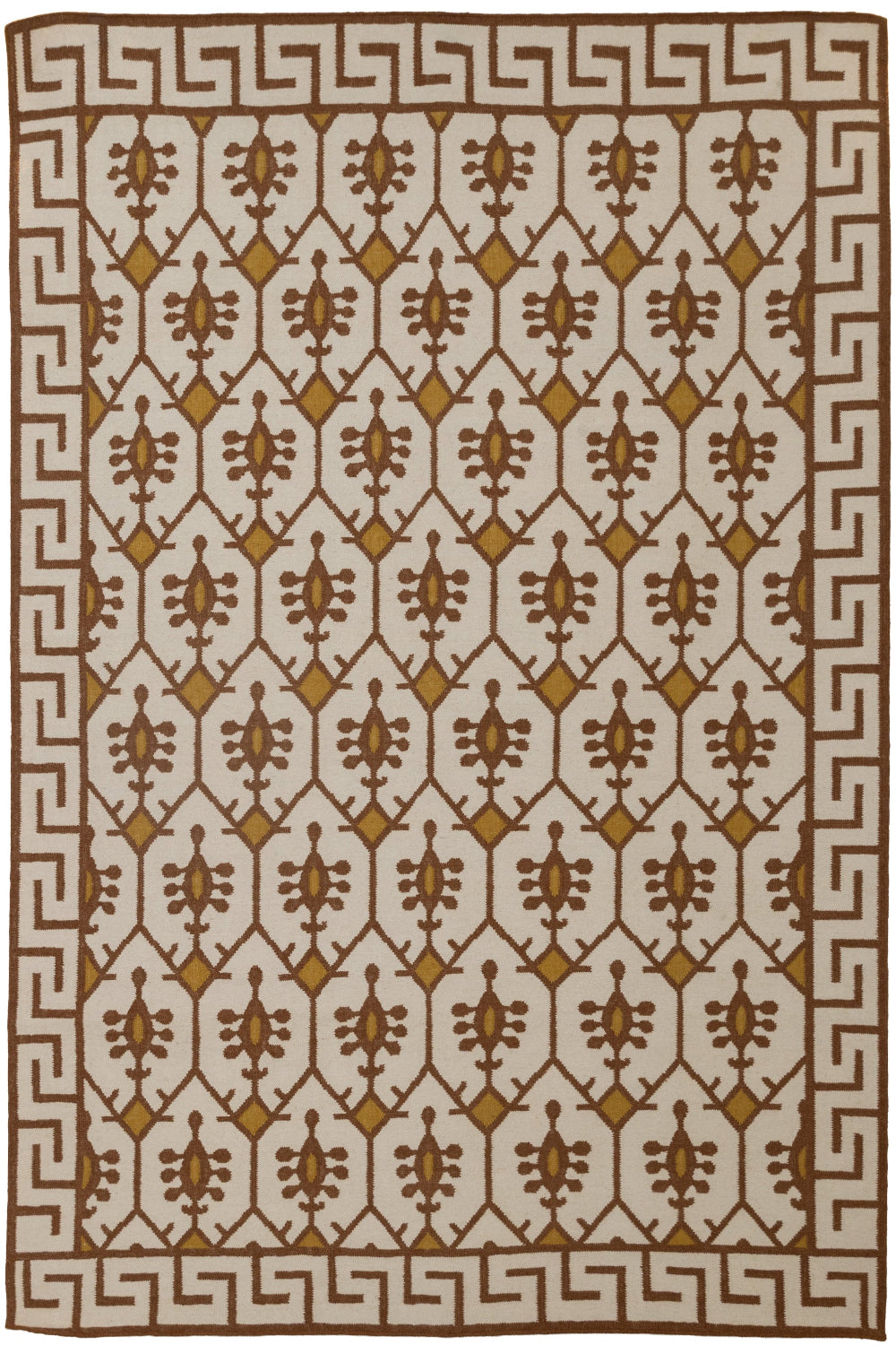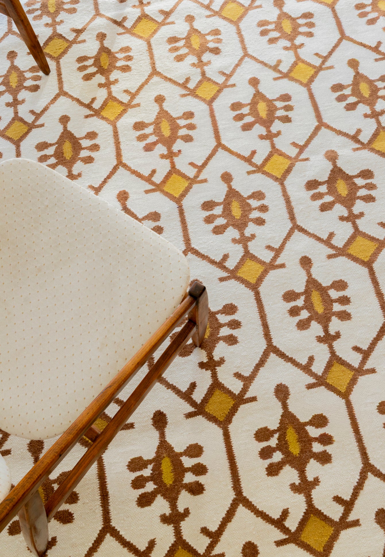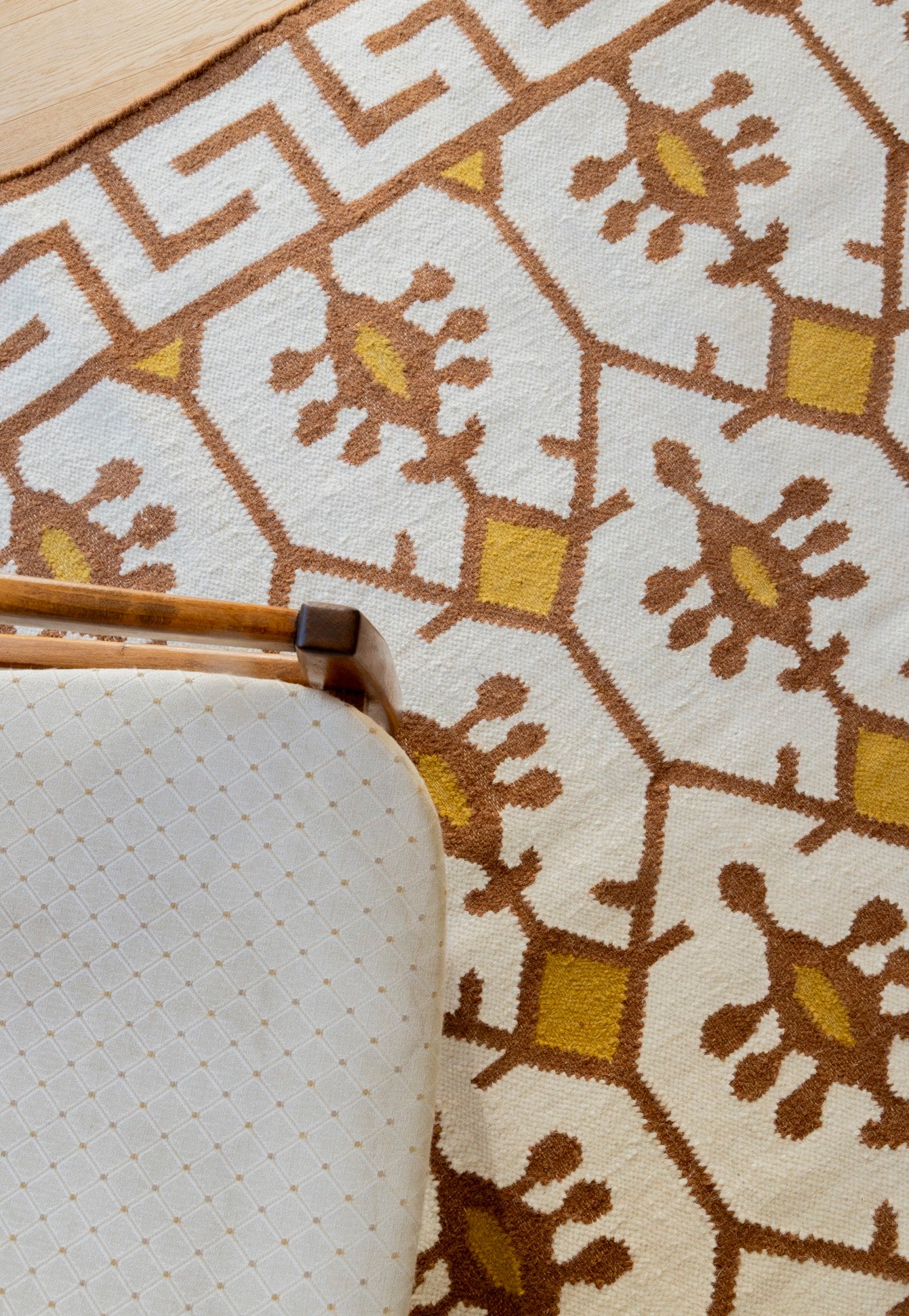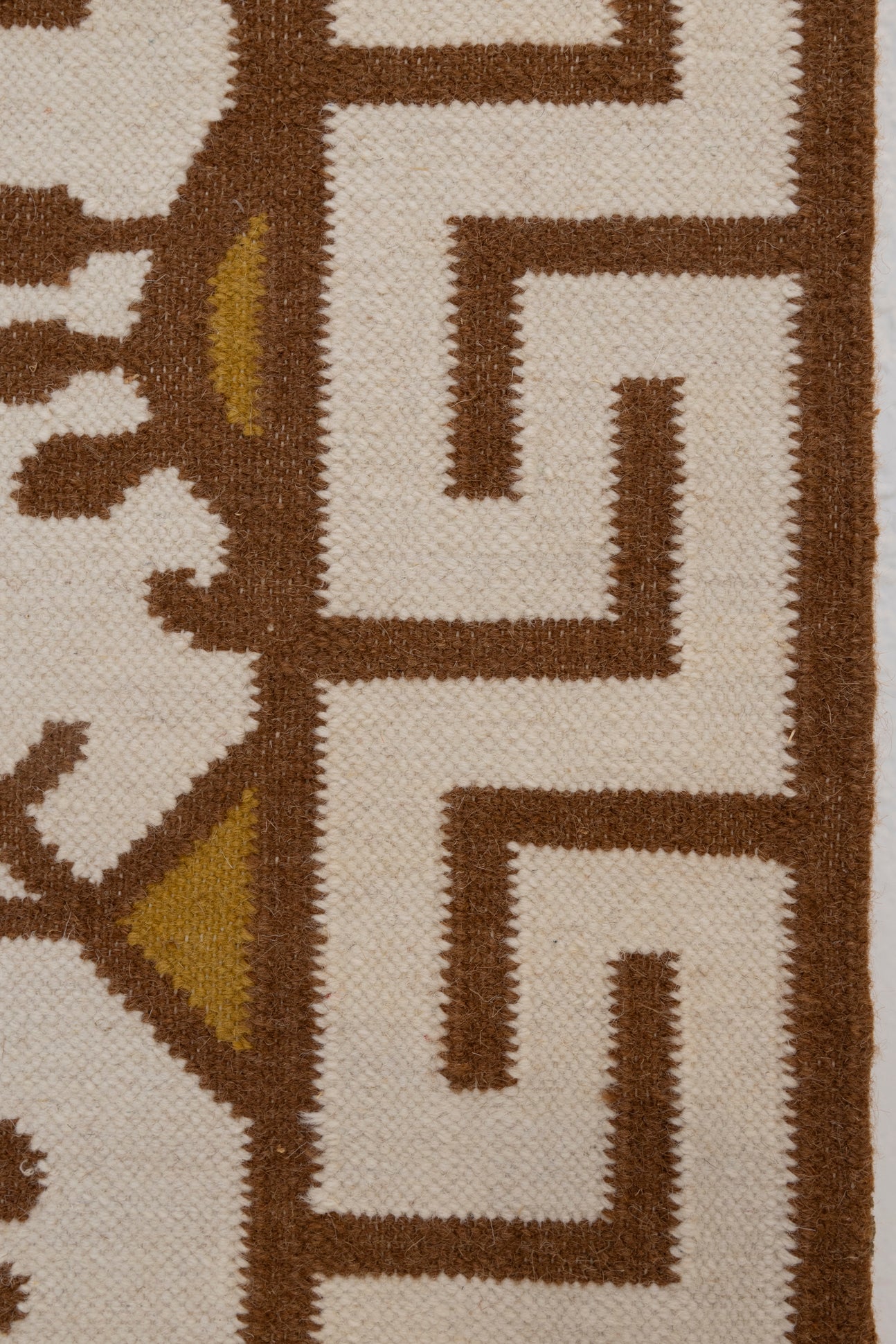 All our Dhurrie Kilims are handwoven in India. The weave is firm, smooth, and nap-free. The materials we use are 80% pure wool and 20% cotton, a very strong and durable blend. Our kilims are approximately 3 mm thick, with a 5 mm hem.